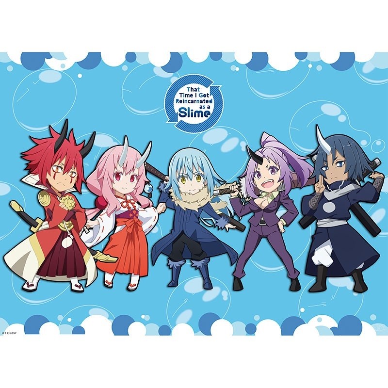 Οριζόντια αφίσα με τους Benimaru, Shuna, Rimuru, Shion και Souei σε chibi μορφές, από την anime σειρά That Time I got Reincarnated as a Slime.