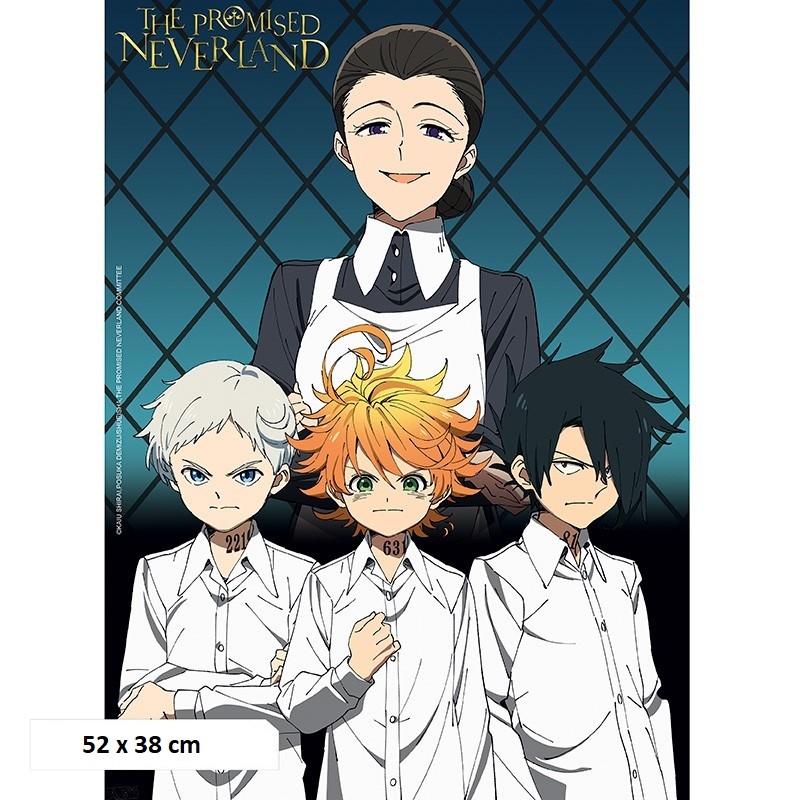 Κάθετη αφίσα με τους χαρακτήρες Emma, Norman, Ray και Isabella από την anime σειρά Promised Neverland.