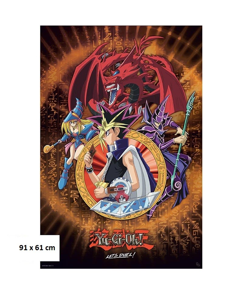 Κάθετη αφίσα με τον Yami Yugi και 3 τέρατα από την τράπουλα του (Slifer the Sky Dragon, Dark Magician, Dark Magician Girl), από την anime σειρά Yu-Gi-Oh.