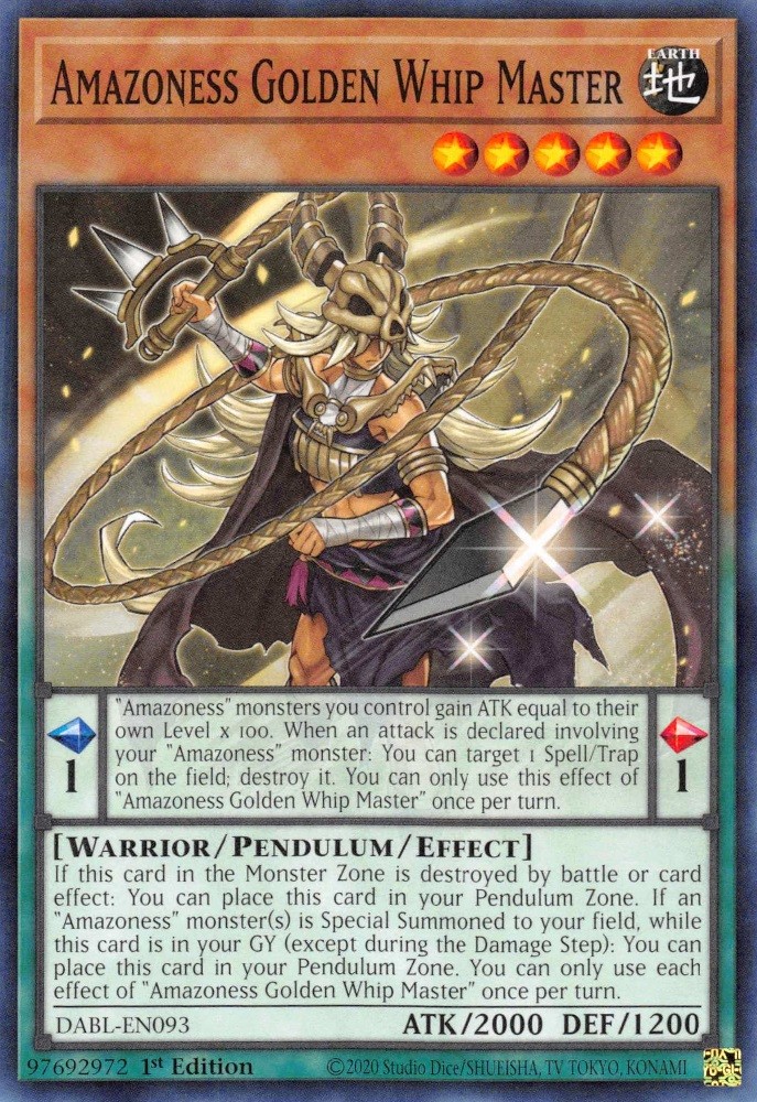 "Amazoness" monsters you control gain ATK equal to their own Level x 100. When an attack is declared involving your "Amazoness" monster: You can target 1 Spell/Trap on the field; destroy it. You can only use this effect of "Amazoness Golden Whip Master" once per turn.