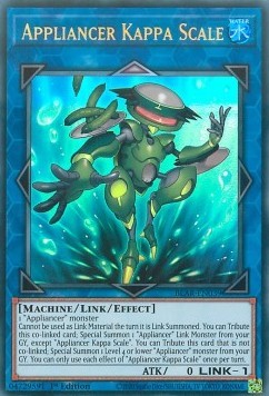 Cannot be used as Link Material the turn it is Link Summoned. You can Tribute this co-linked card; Special Summon 1 "Appliancer" Link Monster from your GY, except "Appliancer Kappa Scale". You can Tribute this card that is not co-linked; Special Summon 1 Level 4 or lower "Appliancer" monster from your GY. You can only use each effect of "Appliancer Kappa Scale" once per turn.