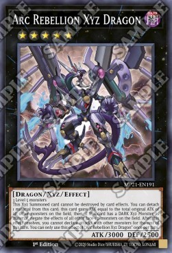 3 Level 5 monsters This Xyz Summoned card cannot be destroyed by card effects. You can detach 1 material from this card; this card gains ATK equal to the total original ATK of all other monsters on the field, then, if this card has a DARK Xyz Monster as material, negate the effects of all other face-up monsters on the field. After this effect resolves, you cannot declare attacks with other monsters for the rest of this turn. You can only use this effect of "Arc Rebellion Xyz Dragon" once per turn.