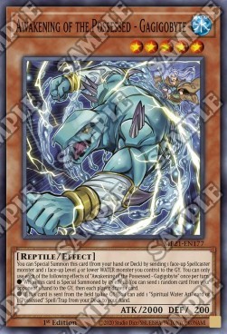 You can Special Summon this card (from your hand or Deck) by sending 1 face-up Spellcaster monster and 1 face-up Level 4 or lower WATER monster you control to the GY. You can only use each of the following effects of "Awakening of the Possessed - Gagigobyte" once per turn. ● When this card is Special Summoned by its effect: You can send 1 random card from your opponent's hand to the GY, then each player draws 1 card. ● If this card is sent from the field to the GY: You can add 1 "Spiritual Water Art" card or 1 "Possessed" Spell/Trap from your Deck to your hand.