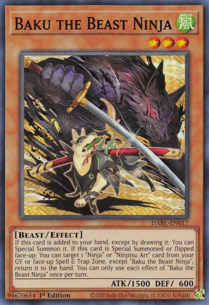 If this card is added to your hand, except by drawing it: You can Special Summon it. If this card is Special Summoned or flipped face-up: You can target 1 "Ninja" or "Ninjitsu Art" card from your GY or face-up Spell & Trap Zone, except "Baku the Beast Ninja"; return it to the hand. You can only use each effect of "Baku the Beast Ninja" once per turn.