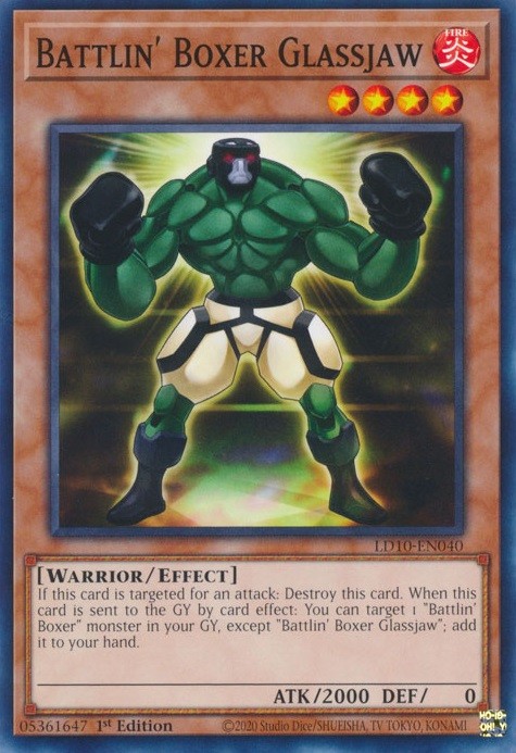 If this card is targeted for an attack: Destroy this card. When this card is sent to the GY by card effect: You can target 1 "Battlin' Boxer" monster in your GY, except "Battlin' Boxer Glassjaw"; add it to your hand.