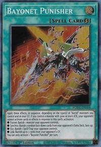Apply these effects, in sequence, depending on the type(s) of "Borrel" monsters you control and in your GY. If you control a monster with 3000 or more ATK, your opponent cannot activate cards or effects in response to this card's activation. ● Fusion: Banish 1 monster your opponent controls. ● Synchro: Banish 3 random face-down cards from your opponent's Extra Deck, face-up. ● Xyz: Banish 1 Spell/Trap your opponent controls. ● Link: Banish up to 3 cards from your opponent's GY. You can only activate 1 "Bayonet Punisher" per turn.