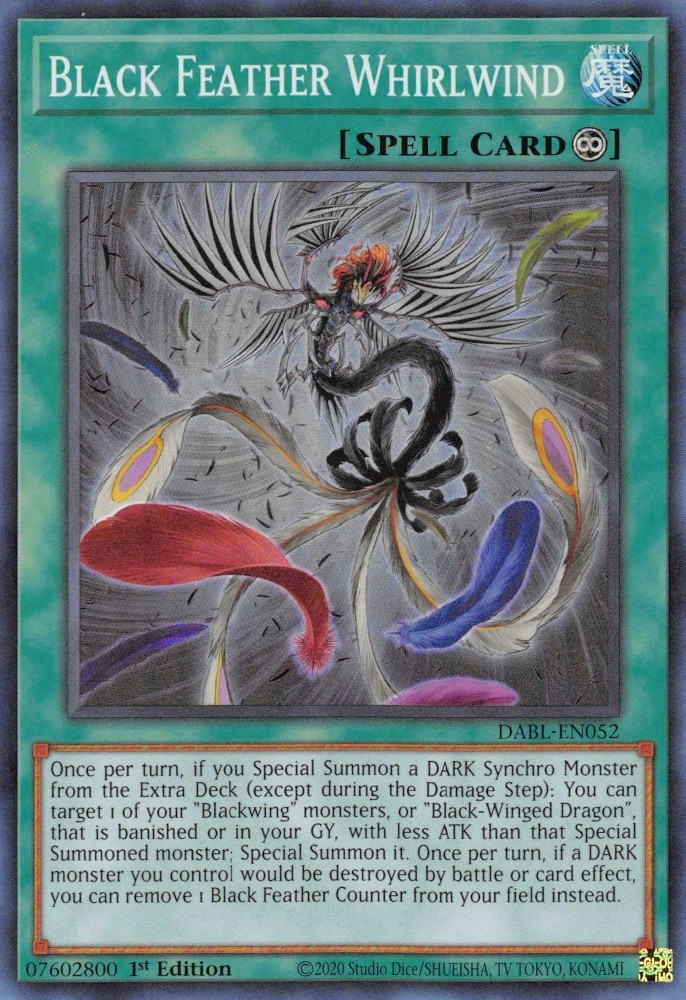 Once per turn, if you Special Summon a DARK Synchro Monster from the Extra Deck (except during the Damage Step): You can target 1 of your "Blackwing" monsters, or "Black-Winged Dragon", that is banished or in your GY, with less ATK than that Special Summoned monster; Special Summon it. Once per turn, if a DARK monster you control would be destroyed by battle or card effect, you can remove 1 Black Feather Counter from your field instead.