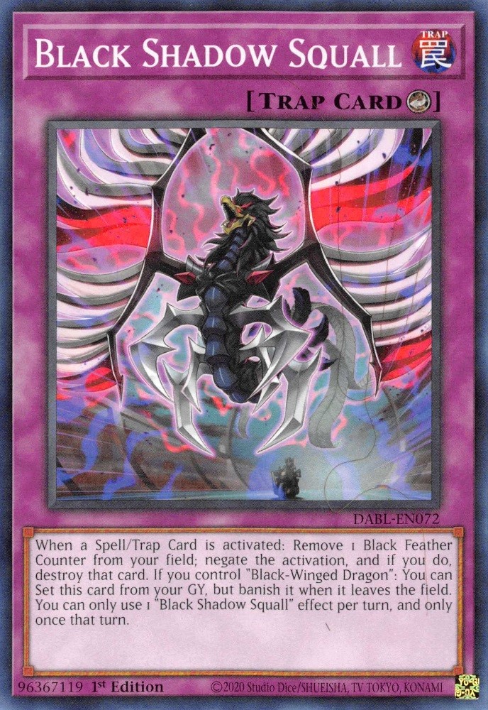 When a Spell/Trap Card is activated: Remove 1 Black Feather Counter from your field; negate the activation, and if you do, destroy that card. If you control "Black-Winged Dragon": You can Set this card from your GY, but banish it when it leaves the field. You can only use 1 "Black Shadow Squall" effect per turn, and only once that turn.