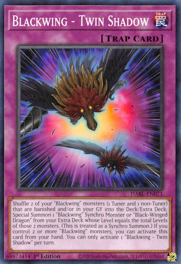 Shuffle 2 of your "Blackwing" monsters (1 Tuner and 1 non-Tuner) that are banished and/or in your GY into the Deck/Extra Deck; Special Summon 1 "Blackwing" Synchro Monster or "Black-Winged Dragon" from your Extra Deck whose Level equals the total Levels of those 2 monsters. (This is treated as a Synchro Summon.) If you control 2 or more "Blackwing" monsters, you can activate this card from your hand. You can only activate 1 "Blackwing - Twin Shadow" per turn.