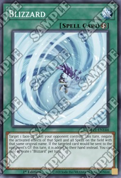 Target 1 face-up Spell your opponent controls; this turn, negate the activated effects of that Spell and all Spells on the field with that same original name. If the targeted card would be sent to the opponent's GY this turn, it is added to their hand instead. You can only activate 1 "Blizzard" per turn.