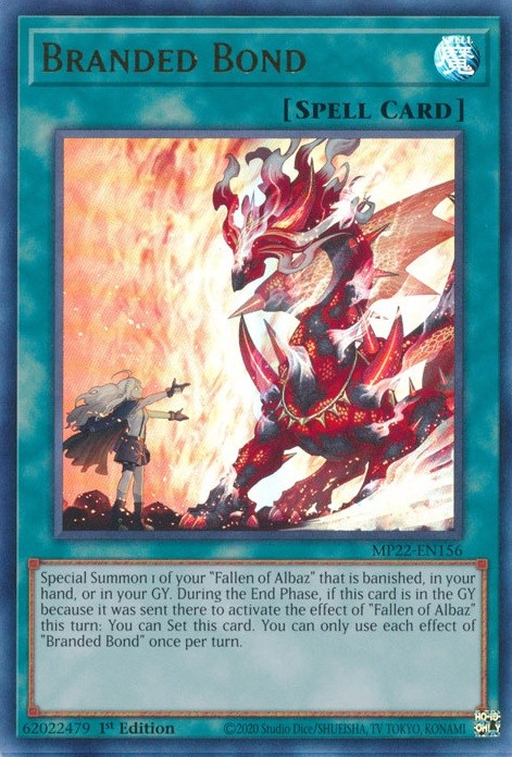 Special Summon 1 of your "Fallen of Albaz" that is banished, in your hand, or in your GY. During the End Phase, if this card is in the GY because it was sent there to activate the effect of "Fallen of Albaz" this turn: You can Set this card. You can only use each effect of "Branded Bond" once per turn.