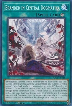 If you Special Summon 1 Ritual Monster (and no other cards) by a Spell Card or effect (except during the Damage Step): You can look at either player's Extra Deck, and send 1 monster from it to the GY. If you Special Summon 1 Fusion Monster (and no other cards) by a Spell Card or effect (except during the Damage Step): You can target that monster; for the rest of this turn, it gains ATK equal to its original ATK, also it can only attack Attack Position monsters your opponent controls. You can only use each effect of "Branded in Central Dogmatika" once per turn.