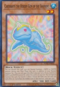 You can discard this card; you can Normal Summon 1 EARTH or WATER monster during your Main Phase this turn, in addition to your Normal Summon/Set. (You can only gain this effect once per turn.) If you control an EARTH and WATER monster(s), while this card is in your GY: You can Special Summon this card, but banish it when it leaves the field. You can only use each effect of "Cartorhyn the Hidden Gem of the Seafront" once per turn.