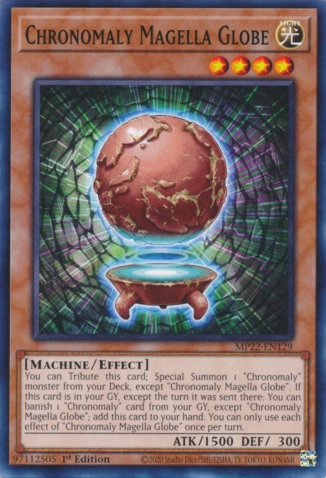 You can Tribute this card; Special Summon 1 "Chronomaly" monster from your Deck, except "Chronomaly Magella Globe". If this card is in your GY, except the turn it was sent there: You can banish 1 "Chronomaly" card from your GY, except "Chronomaly Magella Globe"; add this card to your hand. You can only use each effect of "Chronomaly Magella Globe" once per turn.