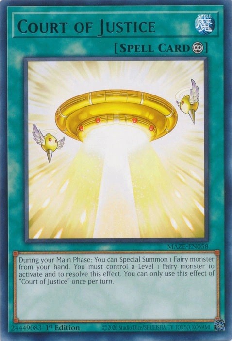 Once per turn: You can Special Summon 1 Fairy-Type monster from your hand. You must control a face-up Level 1 Fairy-Type monster to activate and to resolve this effect. You can only activate the effect of one "Court of Justice" per turn.