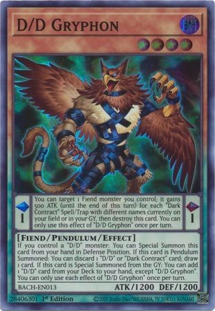 Pendulum EffectYou can target 1 Fiend monster you control; it gains 500 ATK (until the end of this turn) for each "Dark Contract" Spell/Trap with different names currently on your field or in your GY, then destroy this card. You can only use this effect of "D/D Gryphon" once per turn.Monster EffectIf you control a "D/D" monster: You can Special Summon this card from your hand in Defense Position. If this card is Pendulum Summoned: You can discard 1 "D/D" or "Dark Contract" card; draw 1 card. If this card is Special Summoned from the GY: You can add 1 "D/D" card from your Deck to your hand, except "D/D Gryphon". You can only use each effect of "D/D Gryphon" once per turn.