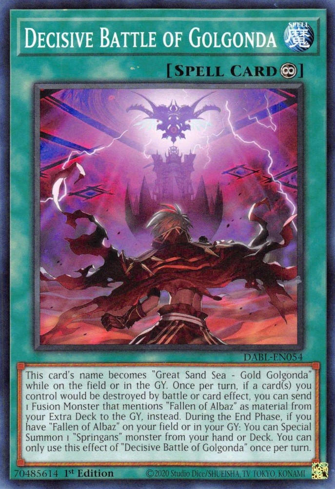 This card's name becomes "Great Sand Sea - Gold Golgonda" while on the field or in the GY. Once per turn, if a card(s) you control would be destroyed by battle or card effect, you can send 1 Fusion Monster that mentions "Fallen of Albaz" as material from your Extra Deck to the GY, instead. During the End Phase, if you have "Fallen of Albaz" on your field or in your GY: You can Special Summon 1 "Springans" monster from your hand or Deck. You can only use this effect of "Decisive Battle of Golgonda" once per turn.