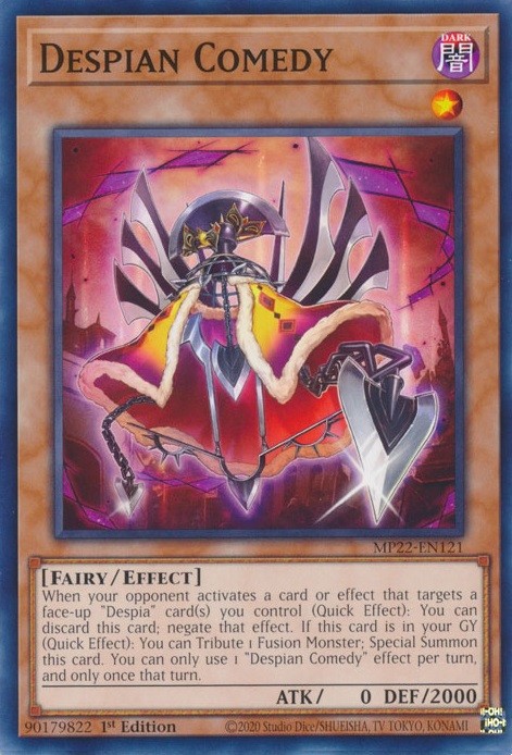 When your opponent activates a card or effect that targets a face-up "Despia" card(s) you control (Quick Effect): You can discard this card; negate that effect. If this card is in your GY (Quick Effect): You can Tribute 1 Fusion Monster; Special Summon this card. You can only use 1 "Despian Comedy" effect per turn, and only once that turn.