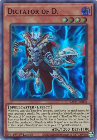 While you control a "Blue-Eyes" monster, you choose the attack targets for your opponent's attacks. You can only use each of the following effects of "Dictator of D." once per turn. You can send 1 "Blue-Eyes White Dragon" from your hand or Deck to the GY; Special Summon this card from your hand. You can discard 1 "Blue-Eyes White Dragon", or 1 card that mentions it, then target 1 "Blue-Eyes" monster in your GY; Special Summon it.