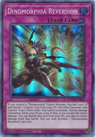 If you control a "Dinomorphia" Fusion Monster: Pay half your LP and banish 1 Counter Trap from your GY; this effect becomes that Counter Trap's effect when that card is activated. During damage calculation while your LP are 2000 or less, if you would take battle damage: You can banish this card from your GY; you take no battle damage from that battle. You can only activate 1 "Dinomorphia Reversion" per turn.