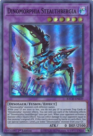 While your LP are 2000 or less, you do not pay LP to activate Trap Cards or "Dinomorphia" monster effects. You can only use each of the following effects of "Dinomorphia Stealthbergia" once per turn. When your opponent activates a monster effect (Quick Effect): You can inflict damage to your opponent equal to that monster's original ATK. If this card is destroyed by battle or card effect: You can Special Summon 1 Level 4 or lower "Dinomorphia" monster from your GY.