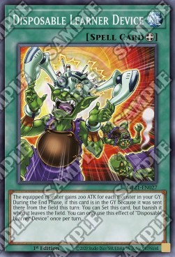 The equipped monster gains 200 ATK for each monster in your GY. During the End Phase, if this card is in the GY because it was sent there from the field this turn: You can Set this card, but banish it when it leaves the field. You can only use this effect of "Disposable Learner Device" once per turn.