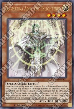 Cannot be destroyed by battle with a monster Special Summoned from the Extra Deck. You can only use each of the following effects of "Dogmatika Adin, the Enlightened" once per turn. If a monster Special Summoned from the Extra Deck is on the field: You can Special Summon this card from your hand. If this card on the field is destroyed by battle or card effect: You can Special Summon 1 "Dogmatika" monster from your Deck, except "Dogmatika Adin, the Enlightened".