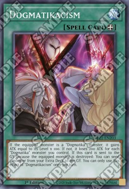 If the equipped monster is a "Dogmatika" monster, it gains ATK equal to its Level x 100. If not, it loses 200 ATK for each "Dogmatika" monster you control. If this card is sent to the GY because the equipped monster is destroyed: You can send 1 monster from your Extra Deck to the GY. You can only use this effect of "Dogmatikacism" once per turn.