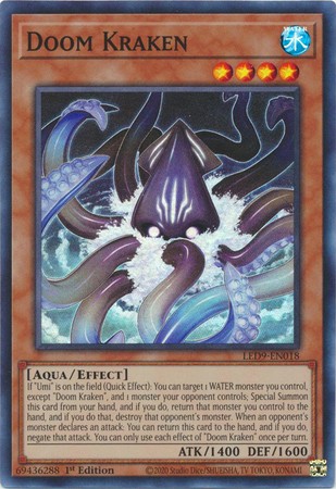 If "Umi" is on the field (Quick Effect): You can target 1 WATER monster you control, except "Doom Kraken", and 1 monster your opponent controls; Special Summon this card from your hand, and if you do, return that monster you control to the hand, and if you do that, destroy that opponent's monster. When an opponent's monster declares an attack: You can return this card to the hand, and if you do, negate that attack. You can only use each effect of "Doom Kraken" once per turn.
