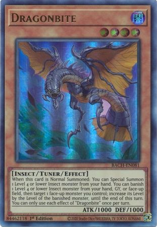 When this card is Normal Summoned: You can Special Summon 1 Level 4 or lower Insect monster from your hand. You can banish 1 Level 4 or lower Insect monster from your hand, GY, or face-up field, then target 1 face-up monster you control; increase its Level by the Level of the banished monster, until the end of this turn. You can only use each effect of "Dragonbite" once per turn.