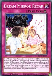 If a "Dream Mirror" monster you control would be Tributed to activate its own effect, shuffle it into the Deck instead of sending it to the GY. During the Main Phase: You can send this face-up card to the GY; place 1 of your "Dream Mirror of Joy" or "Dream Mirror of Terror" that is banished or in your GY, face-up in your Field Zone, then you can Special Summon 1 monster from your hand that specifically lists that card you placed in its text.