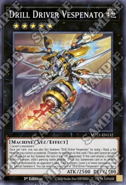 2 Level 5 monsters Once per turn, you can also Xyz Summon "Drill Driver Vespenato" by using 1 Rank 4 Xyz Monster you control as material. (Transfer its materials to this card.) This card cannot be used as material for an Xyz Summon the turn it was Xyz Summoned. If this card attacks a Defense Position monster, inflict piercing battle damage. If this Xyz Summoned card in its owner's control is destroyed by an opponent's card: You can target 1 Level 5 or lower monster in your GY; Special Summon it. You can only use this effect of "Drill Driver Vespenato" once per turn.