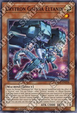 Cannot be Normal Summoned/Set. Must be Special Summoned with the effect of a "Drytron" card. You can Tribute 1 other "Drytron" monster, or 1 Ritual Monster, from your hand or field; Special Summon this card from your hand or GY in Defense Position, then you can Special Summon 1 "Drytron" monster with 2000 ATK from your GY, except "Drytron Gamma Eltanin". You cannot Special Summon monsters, except monsters that cannot be Normal Summoned/Set, the turn you activate this effect. You can only use this effect of "Drytron Gamma Eltanin" once per turn.