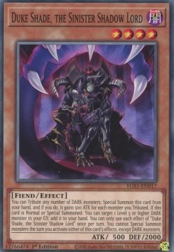 You can Tribute any number of DARK monsters; Special Summon this card from your hand, and if you do, it gains 500 ATK for each monster you Tributed. If this card is Normal or Special Summoned: You can target 1 Level 5 or higher DARK monster in your GY; add it to your hand. You can only use each effect of "Duke Shade, the Sinister Shadow Lord" once per turn. You cannot Special Summon monsters the turn you activate either of this card's effects, except DARK monsters.