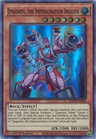 You can Tribute 1 Effect Monster: Special Summon this card from your hand, then Special Summon 1 "Epigonos Token" (Level 1/ATK 0/ DEF 0) with the same Type and Attribute as the Tributed monster's original Type and Attribute. You can only use this effect of "Epigonen, the Impersonation Invader" once per turn.