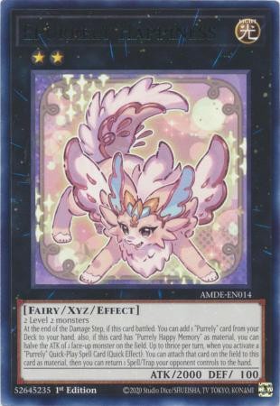 At the end of the Damage Step, if this card battled: You can add 1 "Purrely" card from your Deck to your hand, also, if this card has "Purrely Happy Memory" as material, you can halve the ATK of 1 face-up monster on the field. Up to thrice per turn, when you activate a "Purrely" Quick-Play Spell Card (Quick Effect): You can attach that card on the field to this card as material, then you can return 1 Spell/Trap your opponent controls to the hand.