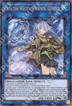 2 monsters, including a WATER monster (This card is always treated as a "Familiar-Possessed" card.) You can target 1 WATER monster in your opponent's GY; Special Summon it to your zone this card points to. If this Link Summoned card is destroyed by battle, or is destroyed by an opponent's card effect while in its owner's Monster Zone: You can add 1 WATER monster with 1500 or less DEF from your Deck to your hand. You can only use each effect of "Eria the Water Charmer, Gentle" once per turn.