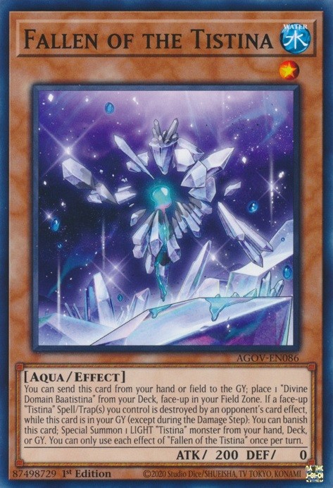 You can send this card from your hand or field to the GY; place 1 "Divine Domain Baatistina" from your Deck, face-up in your Field Zone. If a face-up "Tistina" Spell/Trap(s) you control is destroyed by an opponent's card effect, while this card is in your GY (except during the Damage Step): You can banish this card; Special Summon 1 LIGHT "Tistina" monster from your hand, Deck, or GY. You can only use each effect of "Fallen of the Tistina" once per turn.