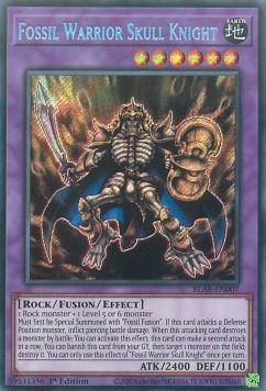 Must first be Special Summoned with "Fossil Fusion". If this card attacks a Defense Position monster, inflict piercing battle damage. When this attacking card destroys a monster by battle: You can activate this effect; this card can make a second attack in a row. You can banish this card from your GY, then target 1 monster on the field; destroy it. You can only use this effect of "Fossil Warrior Skull Knight" once per turn.