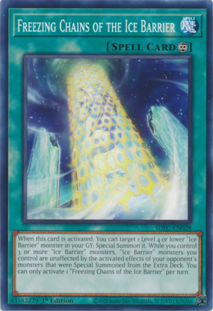 When this card is activated: You can target 1 Level 4 or lower "Ice Barrier" monster in your GY; Special Summon it. While you control 3 or more "Ice Barrier" monsters, "Ice Barrier" monsters you control are unaffected by the activated effects of your opponent's monsters that were Special Summoned from the Extra Deck. You can only activate 1 "Freezing Chains of the Ice Barrier" per turn.