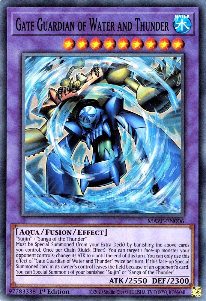 Must be Special Summoned (from your Extra Deck) by banishing the above cards you control. Once per Chain (Quick Effect): You can target 1 face-up monster your opponent controls; change its ATK to 0 until the end of this turn. You can only use this effect of "Gate Guardian of Water and Thunder" twice per turn. If this face-up Special Summoned card in its owner's control leaves the field because of an opponent's card: You can Special Summon 1 of your banished "Suijin" or "Sanga of the Thunder".