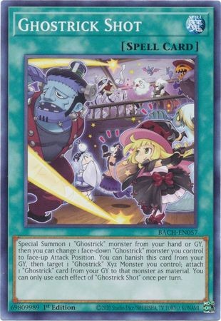 Special Summon 1 "Ghostrick" monster from your hand or GY, then you can change 1 face-down "Ghostrick" monster you control to face-up Attack Position. You can banish this card from your GY, then target 1 "Ghostrick" Xyz Monster you control; attach 1 "Ghostrick" card from your GY to that monster as material. You can only use each effect of "Ghostrick Shot" once per turn.