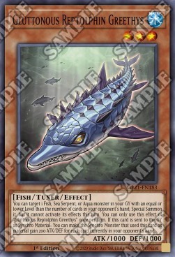 You can target 1 Fish, Sea Serpent, or Aqua monster in your GY with an equal or lower Level than the number of cards in your opponent's hand; Special Summon it, but it cannot activate its effects this turn. You can only use this effect of "Gluttonous Reptolphin Greethys" once per turn. If this card is sent to the GY as Synchro Material: You can make the Synchro Monster that used this card as material gain 200 ATK/DEF for each card currently in your opponent's hand.