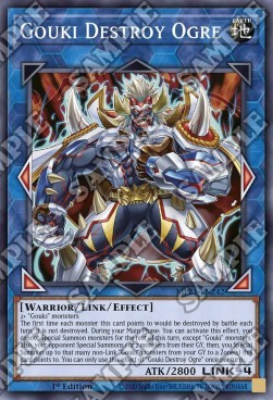 2+ "Gouki" monsters The first time each monster this card points to would be destroyed by battle each turn, it is not destroyed. During your Main Phase: You can activate this effect; you cannot Special Summon monsters for the rest of this turn, except "Gouki" monsters, also, your opponent Special Summons 1 or 2 monsters from their GY, then, you Special Summon up to that many non-Link "Gouki" monsters from your GY to a Zone(s)