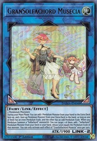 During your Main Phase: You can add 1 Pendulum Monster from your hand to the Extra Deck face-up, and 1 face-up Pendulum Monster from your Extra Deck to the hand, as long as one of them has an even Pendulum Scale, and the other has an odd Pendulum Scale. When you Pendulum Summon a "Solfachord" monster(s): You can target 1 of them; add 1 "Solfachord" Pendulum Monster from your Deck to your hand, whose Level equals the Pendulum Scale of that monster. You can only activate each effect of "GranSolfachord Musecia" once per turn.