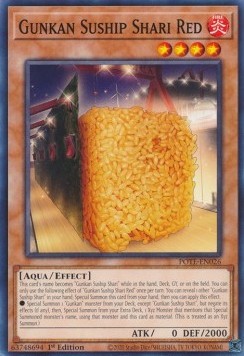 This card's name becomes "Gunkan Suship Shari" while in the hand, Deck, GY, or on the field. You can only use the following effect of "Gunkan Suship Shari Red" once per turn. You can reveal 1 other "Gunkan Suship Shari" in your hand; Special Summon this card from your hand, then you can apply this effect.