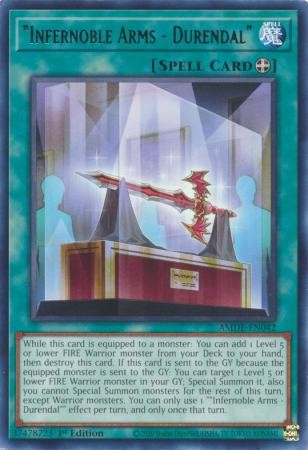 While this card is equipped to a monster: You can add 1 Level 5 or lower FIRE Warrior monster from your Deck to your hand, then destroy this card. If this card is sent to the GY because the equipped monster is sent to the GY: You can target 1 Level 5 or lower FIRE Warrior monster in your GY; Special Summon it, also you cannot Special Summon monsters for the rest of this turn, except Warrior monsters. You can only use 1 ""Infernoble Arms - Durendal"" effect per turn, and only once that turn.