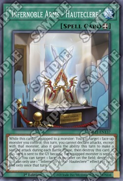 While this card is equipped to a monster: You can target 1 face-up monster you control; this turn, you cannot declare attacks, except with that monster, also it gains the ability this turn to make a second attack during each Battle Phase, then destroy this card. If this card is sent to the GY because the equipped monster is sent to the GY: You can target 1 face-up monster on the field; destroy it. You can only use 1 ""Infernoble Arms - Hauteclere"" effect per turn, and only once that turn.