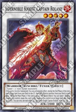 1 Tuner + 1+ non-Tuner monsters If this card is Synchro Summoned: You can activate this effect; during the End Phase of this turn, send 1 Equip Spell from your Deck to the GY, then add 1 Warrior monster from your Deck to your hand. During the Main Phase, if this card is in your GY (Quick Effect): You can target 1 Warrior monster you control; equip this card to that monster you control as an Equip Spell that gives it 500 ATK. You can only use each effect of "Infernoble Knight Captain Roland" once per turn.