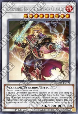 1 Tuner + 1+ non-Tuner monsters If an Equip Card becomes equipped to a monster on the field, even during the Damage Step: You can destroy 1 card on the field. During the End Phase: You can equip 1 Equip Spell from your hand or GY to this card, then you can equip 1 FIRE Warrior monster from your Deck to this card as an Equip Spell that gives it 500 ATK. You can only use each effect of "Infernoble Knight Emperor Charles" once per turn.